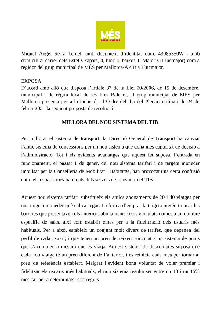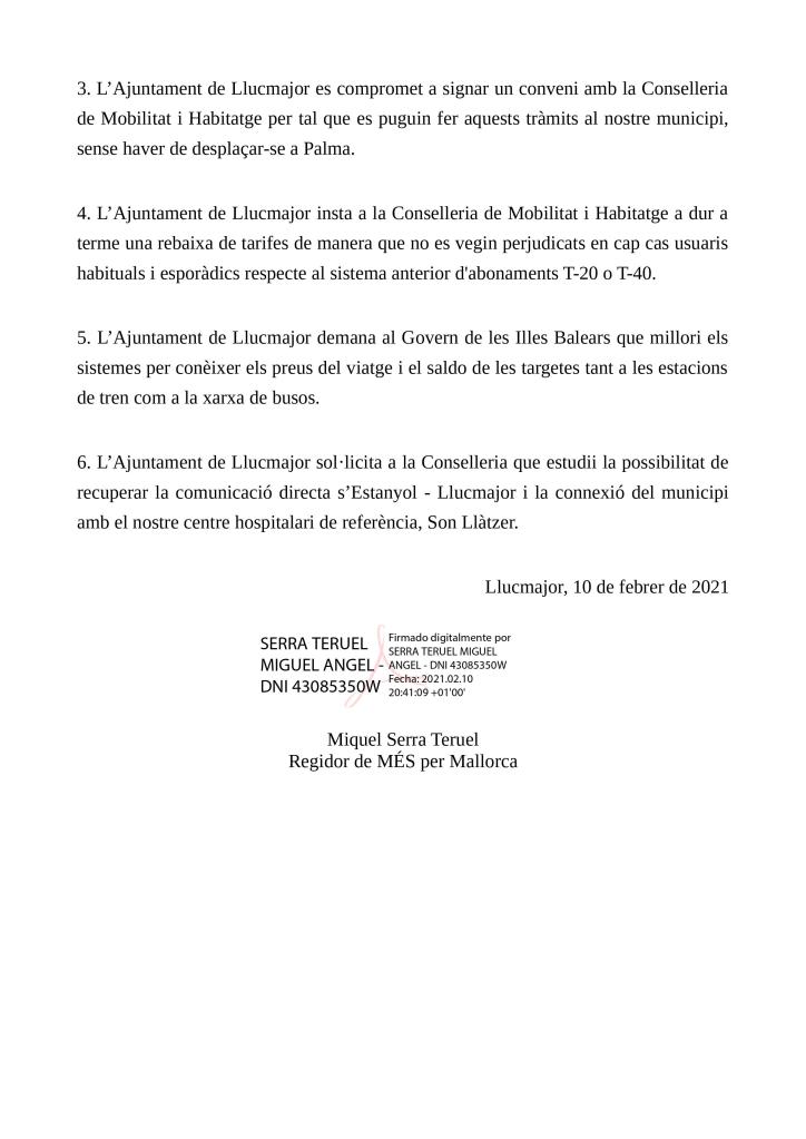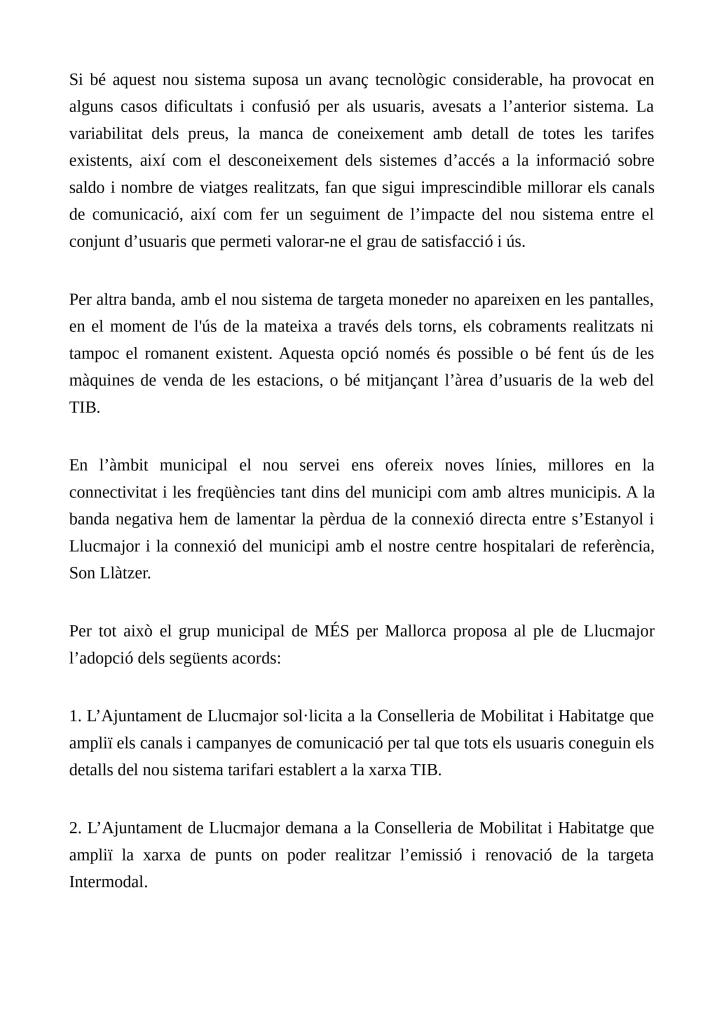 En el document, també reclamam que s’ampliïn els canals i campanyes de comunicació per tal que tots els usuaris coneguin els detalls del nou sistema tarifari i la xarxa de punts on poder realitzar l’emissió i renovació de la targeta intermodal.