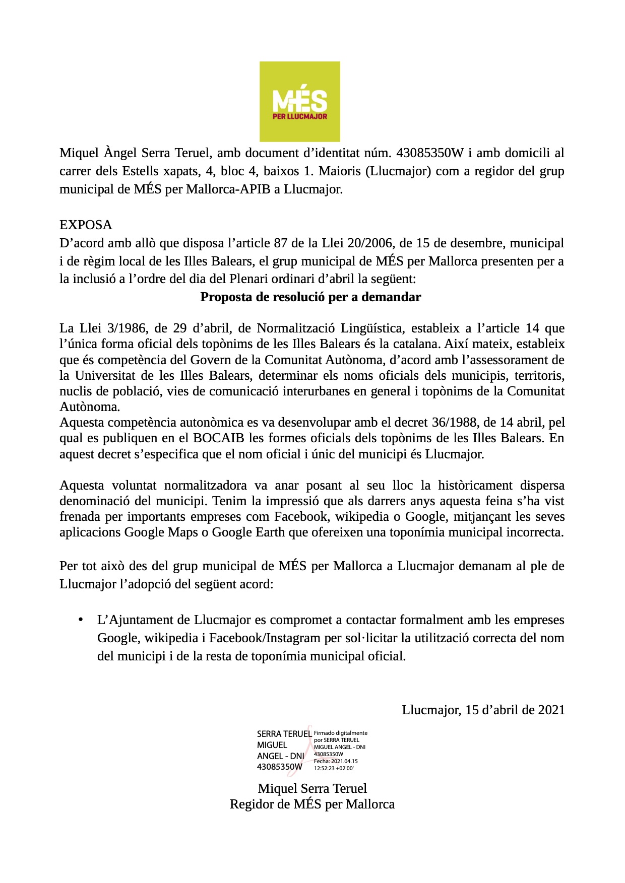 El ple ordinari del mes d’abril aprovà per unanimitat la moció de MÉS per Llucmajor mitjançant la qual demanam a l’Ajuntament que faci les passes pertinents per tal de contactar amb les grans empreses d’internet i que facin l’ús correcte del topònim “Llucmajor” enfront a formes incorrectes com ara “Lluchmajor” o “Lluchmayor”.