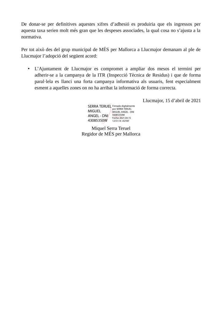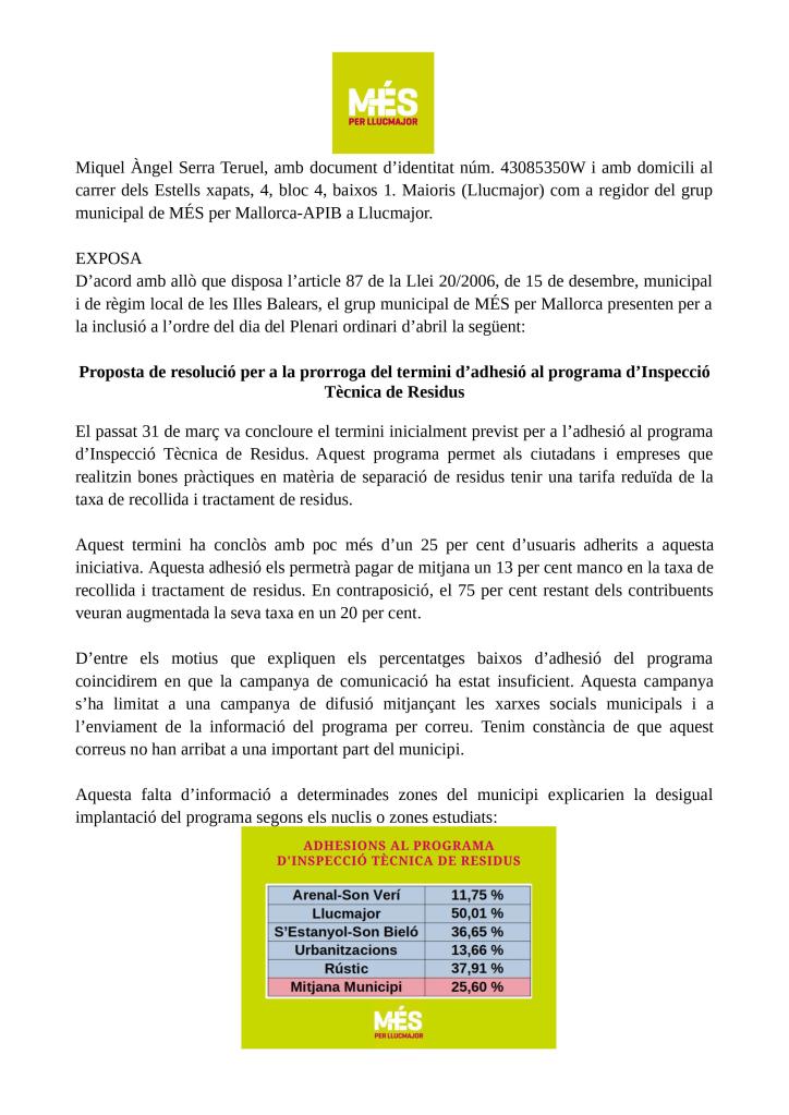Des de MÉS per Llucmajor presentàrem una moció en el passat ple mitjançant la qual reclamàvem a l’equip de govern que ampliï el termini per adherir-se a la ITR, ja que una gran majoria de contribuents no s’hi ha adherit a causa de la mala campanya de comunicació i informació duta a terme.