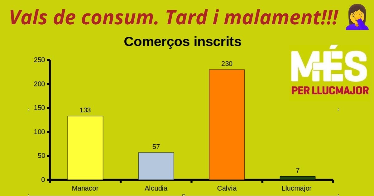 Però hi ha altres municipis que deixen la gestió del pacte llucmajorer en evidència. Com podeu veure en el gràfic adjunt a Alcúdia (20.000 habitants) s’hi adheriren 57 comerços mentre a Calvià (50.000) s’hi sumaren 230 negocis.