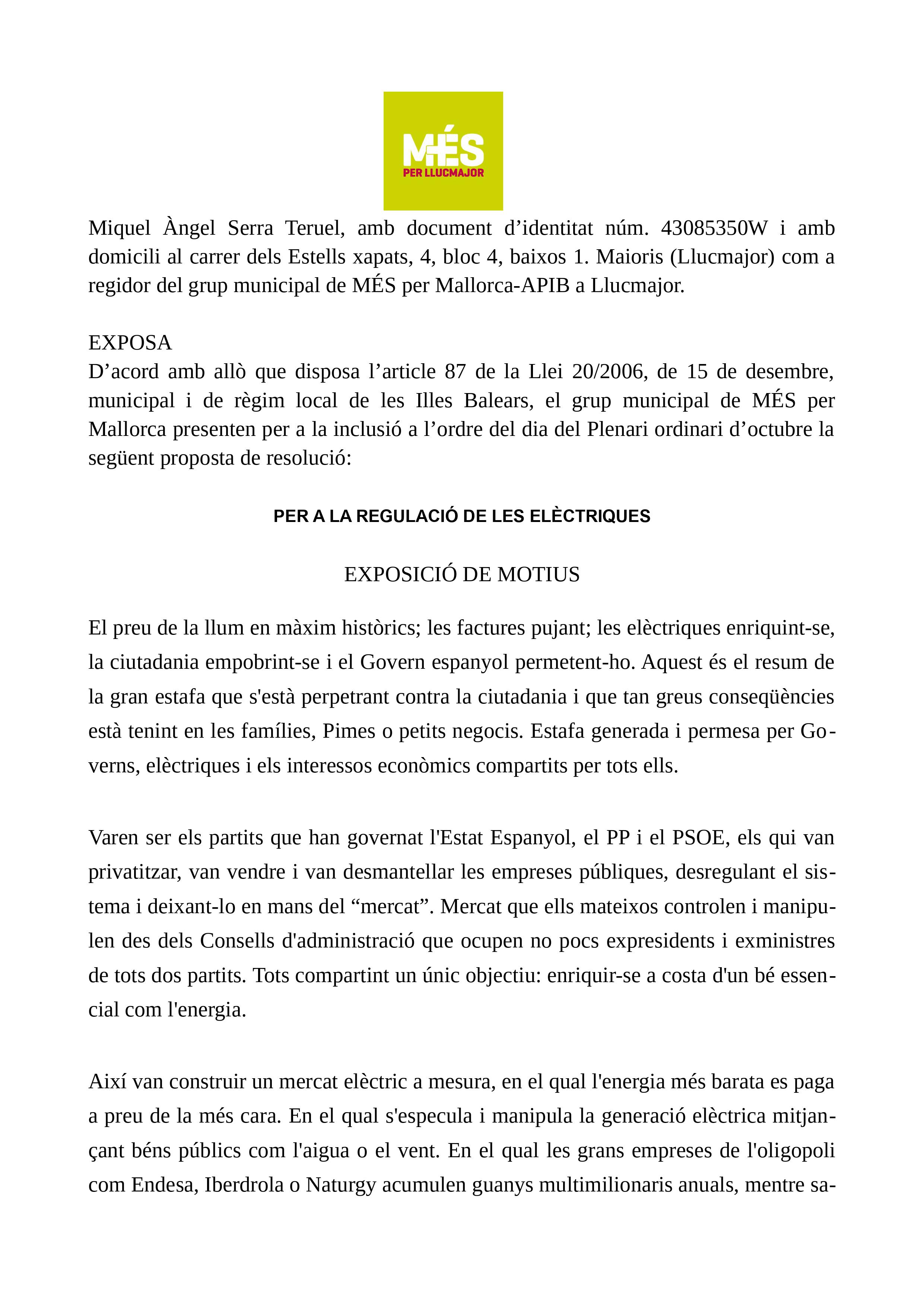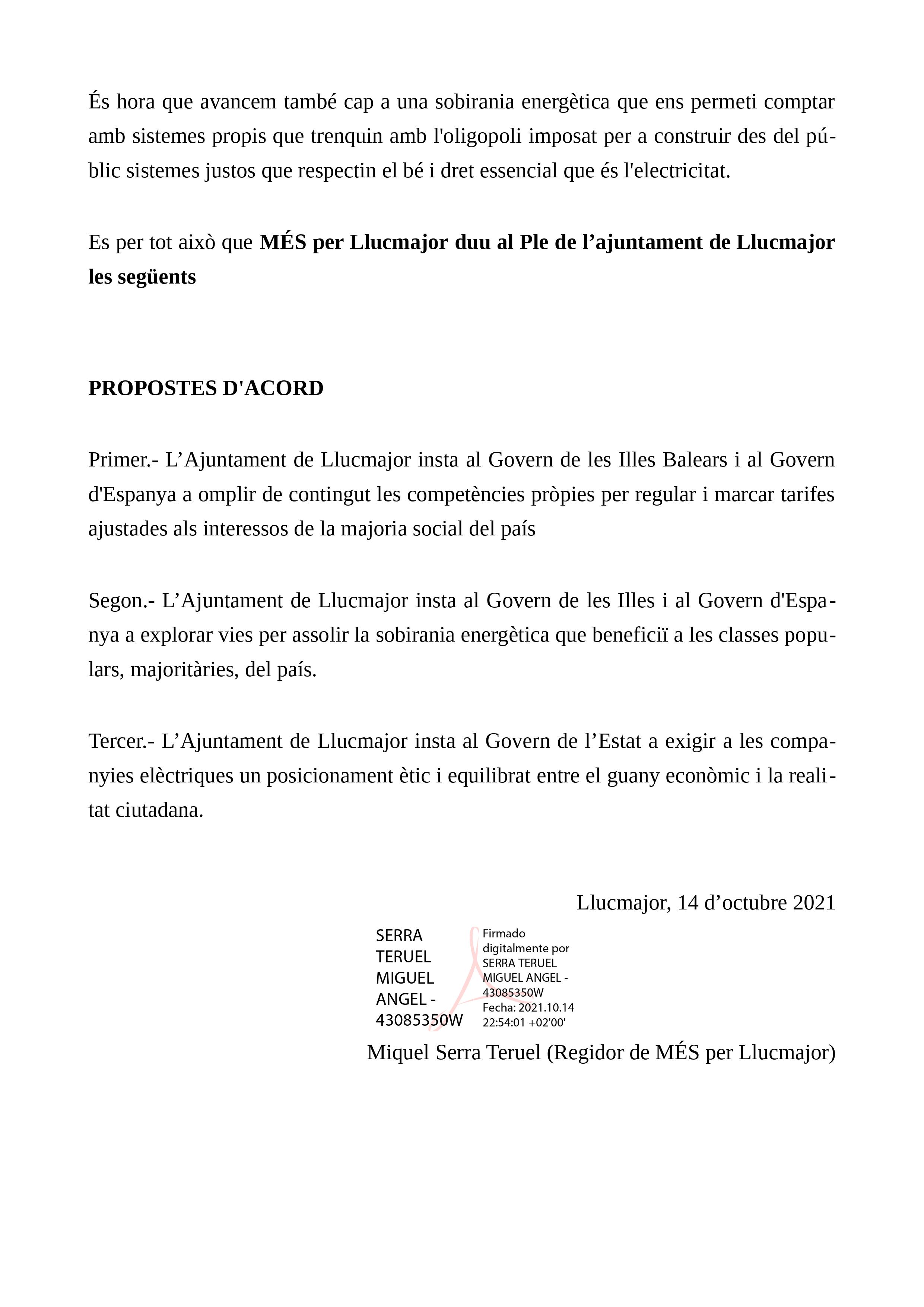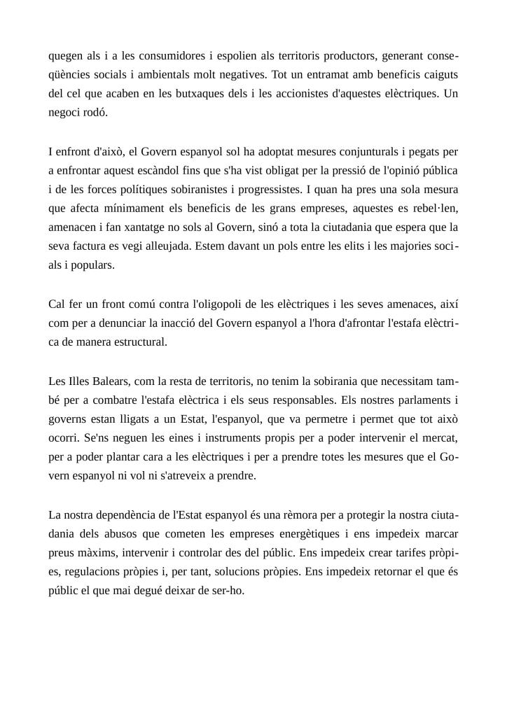 En el ple ordinari del mes d’octubre vàrem presentar una moció per tal de reclamar una regulació de les companyies elèctriques. No aconseguirem aprovar-la. Així i tot, des de MÉS per Mallorca continuarem fent feina per tal de trobar una solució a aquesta situació.